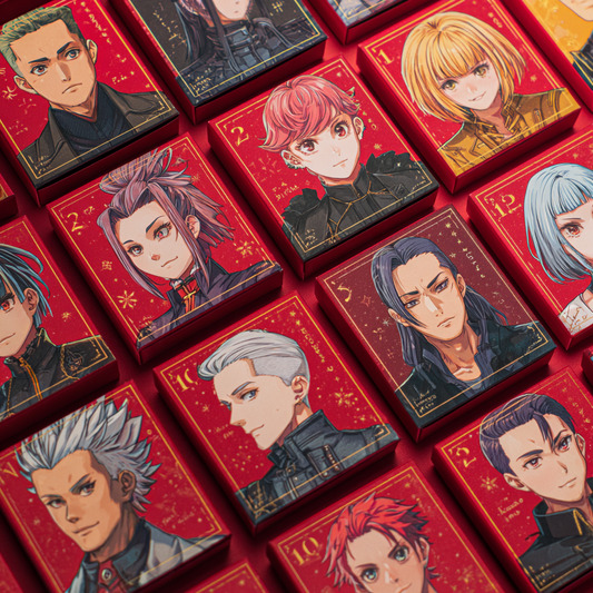 Kalendarz adwentowy z motywem anime zawierający przedmioty związane z koreańską muzyką pop