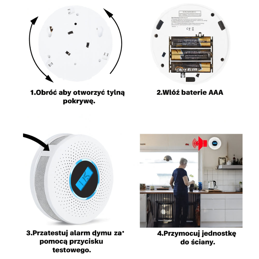 - Podwójna funkcja — wykrywanie dymu oraz tlenku węgla w jednym urządzeniu