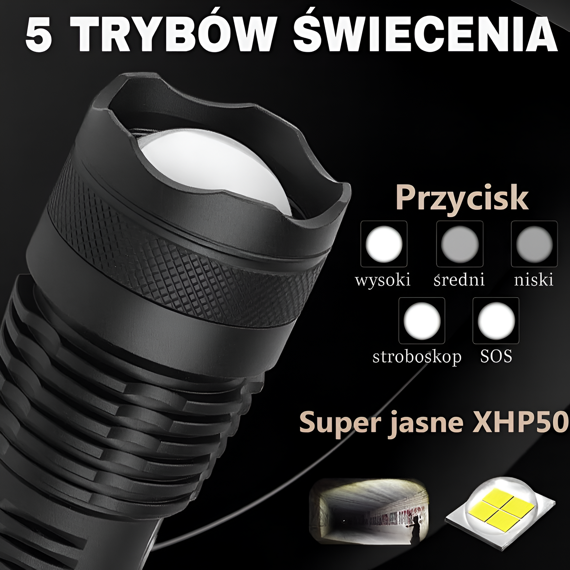 • Model latarki: taktyczna latarka ręczna LED XHP50 z zoomem
